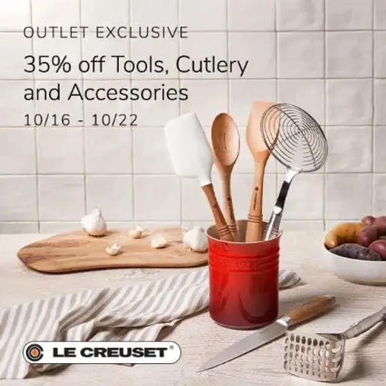 Tools, Cutlery, and Accessories savings valid October 18th – October 22nd, 2025, at participating U.S. Le Creuset Outlets, while supplies last.